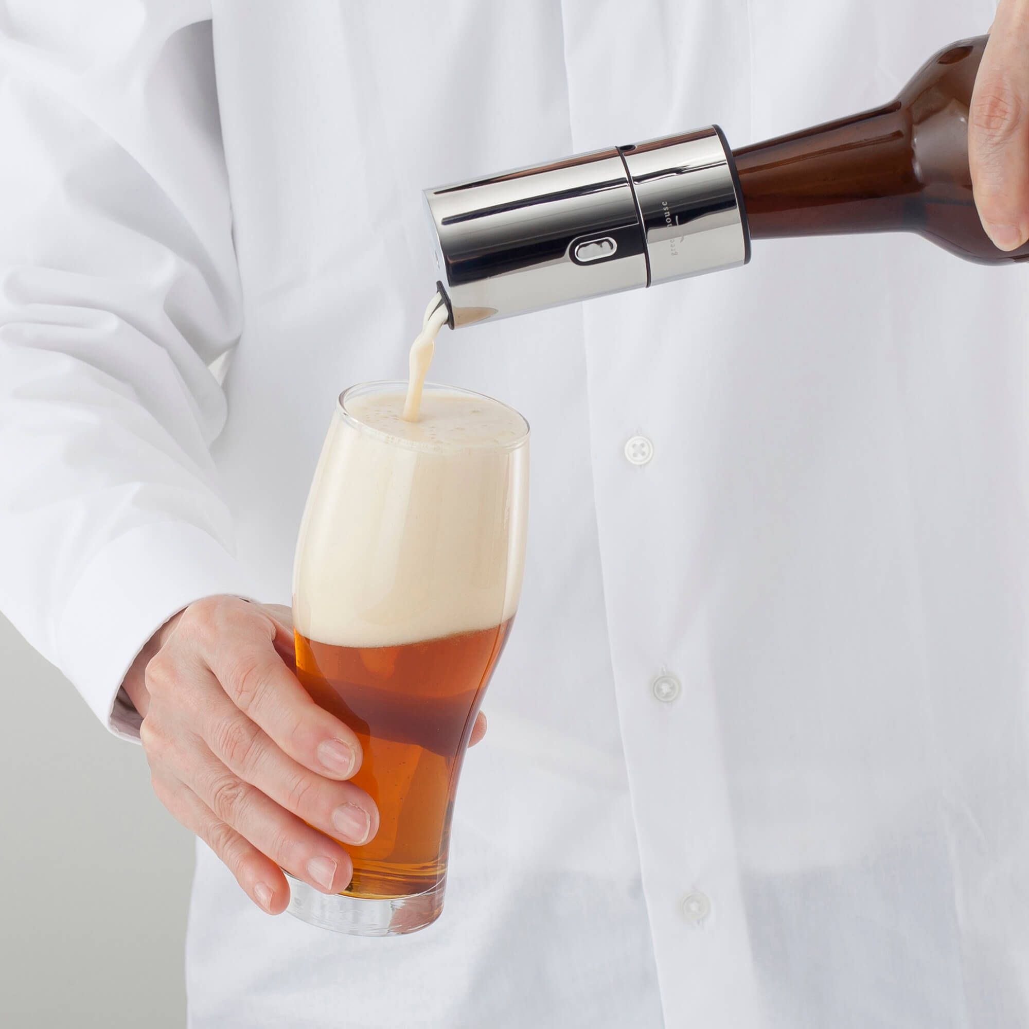 瓶口に付けるだけ、ボタンを押しながら注ぐとクリーミーできめ細かな泡